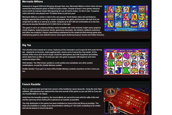 Blackjack fans can enjoy over 30 blackjack variations like American, European and Classic Blackjack, as well as less common variants like Spanish 21, Double Exposure and Vegas Strip. If you’re more of a Roulette person, there are eight variants from which to choose, including American, European, French, and Premier Roulette, among others. Poker fans will be delighted to learn that you are not forgotten about at Casino Action. Microgaming is a software provider for all and you can enjoy a variety of the most popular options like Red Dog, CyberStud Poker, and Poker Pursuit, to name a few. Then there is video poker, which includes popular titles like Deuces Wild, All Aces, Jacks or Better, Joker Poker and more, while dice game options include Sic Bo, Craps and more. Finally, there are some variety or specialty games like Ballistic, Keno and Electric Bingo as well as scratch cards like Bowled Over and Bunny Boiler.