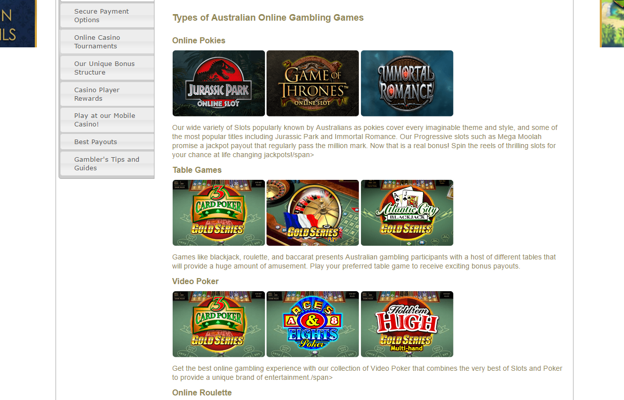 For those looking to strike it lucky, the casino hosts some thrilling progressive pokies that are attached to a massive jackpot. Mega Moolah and LotsaLoot are two popular options, but there are quite a few from which to choose. Table game enthusiasts will be sorted out as well with a range of classic tables like Roulette, Blackjack, Red Dog, Craps, Sic Bo, Baccarat and more. There is also a decent video poker selection with titles like All American Poker, Jacks or Better, Bonus Poker, Deuces Wild, Joker Poker and much more. The entire games selection is available instantly or to download, which is nice in that players have the option in how they choose to play. One thing to note is that there is a wider variety of games available if you choose the download version of the casino.
