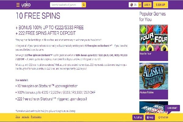Yako Casino tempts new players with a fabulous welcome bonus when you sign up. Players from New Zealand are welcomed with 10 no deposit free spins bonus to use on Starburst online pokie the minute you join the casino. The best part is that this prize is wager-free and casino used to bet on one of the most popular NetEnt games without having to risk anything. Once you make your first deposit, stick around and you will discover your chance to claim a generous welcome bonus of 100% up to NZ$333 as well as an additional 222 free spins to use on Starburst. It seems the angels are smiling down on you from the moment you arrive at Yako Casino. This is indeed an impressive amount of free money and free spins to add to your account, making it a lucrative offer worth accepting.